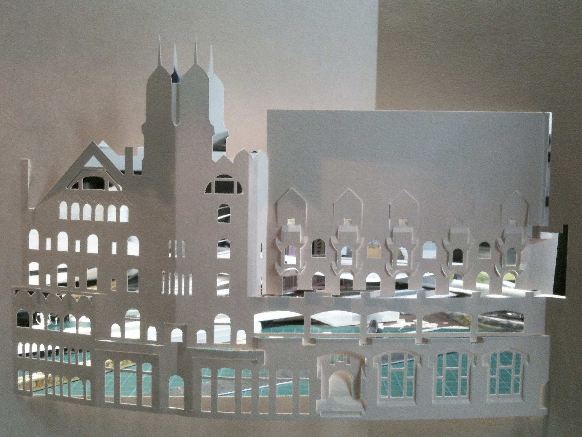 Replica op schaal van het Hotel American Amsterdam, twee zijdes, de gevel aan het Leidseplein en Leidsekade. Hiernaast eerst de uiteindelijke pop-up kaart, ontworpen aan de hand van originele bouwtekeningen van het hotel, fotomateriaal, dan een tekening op schaal op millimeterpapier, dan een proefmodel, dan pas kaart met details, uitgesneden op tienden van een millimeter of kleiner..